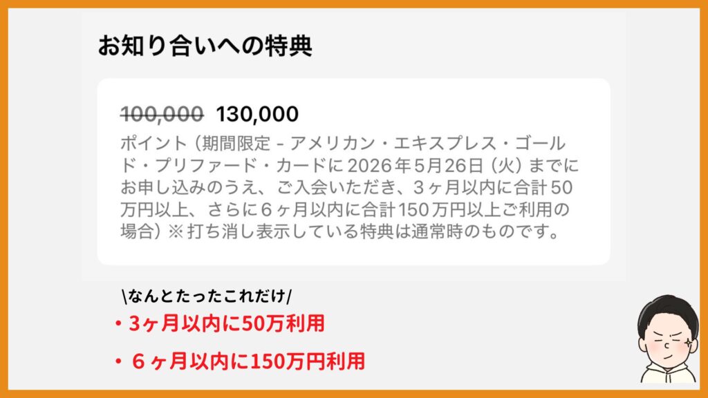 130,000ポイントを獲得するためには、入会から6ヶ月間で150万円(月25万円程度)以上買い物する必要があるので、